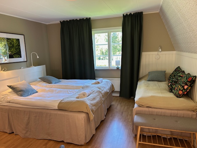 På ovanvåningen i Gula Villan i Skäralid finns tre ljusa och smakfullt inredda rum. I anslutning